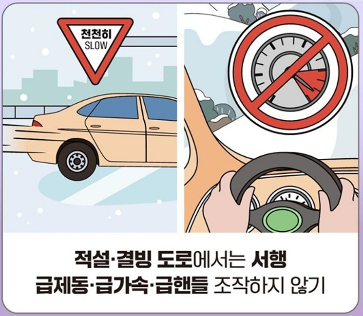 눈이 쌓이거나 얼어 있는 도로에서는 차량 제어가 어렵기 때문에 특히 주의해야 합니다.