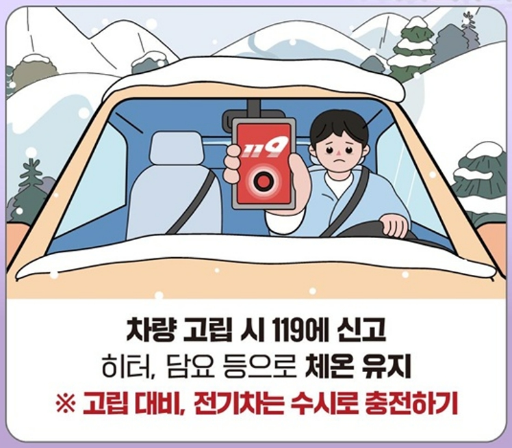 - 차 안에서 히터를 켜 체온을 유지하고, 담요나 보온 의류를 활용해 저체온증을 예방합니다.