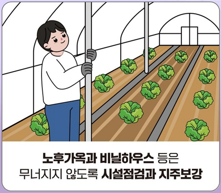 강풍이 동반될 경우 비닐하우스를 단단히 고정하거나 임시로 철거하는 것이 좋습니다.