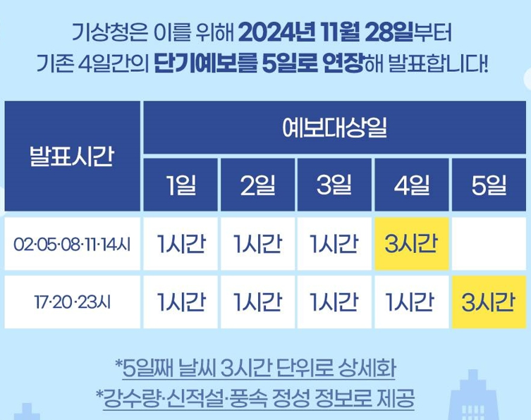 기상청은 2024년 11월 28일부터 기존 4일간 제공되던 단기예보를 5일로 연장해 발표하기로 했습니다. 이는 우리의 일상을 계획하는 데 큰 변화를 가져올 것입니다.