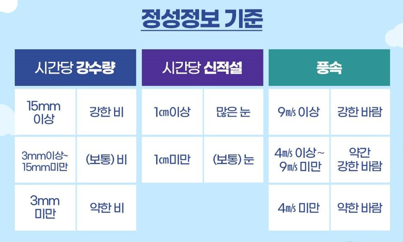 강수량이나 풍속 등의 정성적 표현을 참고하여 날씨 상황을 직관적으로 파악하고, 외출 시 필요한 준비물을 미리 챙기는 습관을 들여보세요.