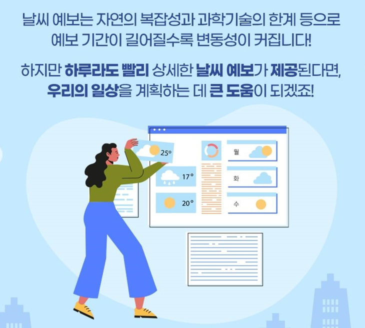 비나 눈이 내리는 시점, 풍속에 따른 체감 온도 등 세부적인 날씨 정보를 통해 옷차림을 정하거나 우산을 준비하는 등 일상적인 선택도 더 효율적으로 할 수 있습니다.