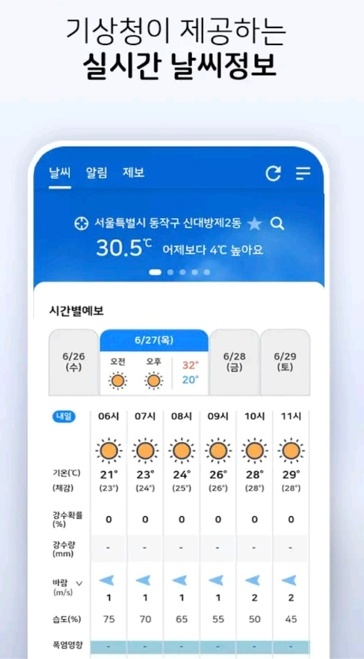- 단기예보 확인: 앱 메인 화면에서 시간대별 날씨 예보를 확인할 수 있습니다.