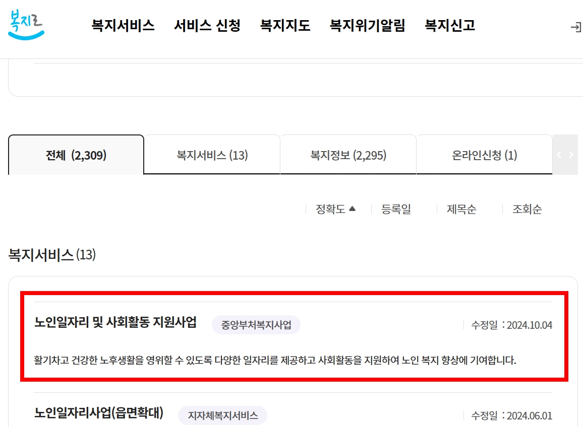 - 검색창에 ‘노인일자리사업’을 입력하여 관련 서비스 목록을 확인합니다.
