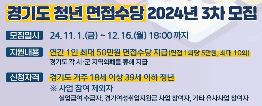경기도 청년 면접수당은 면접 1회당 5만 원씩, 연간 최대 10회, 총 50만 원을 지원합니다.