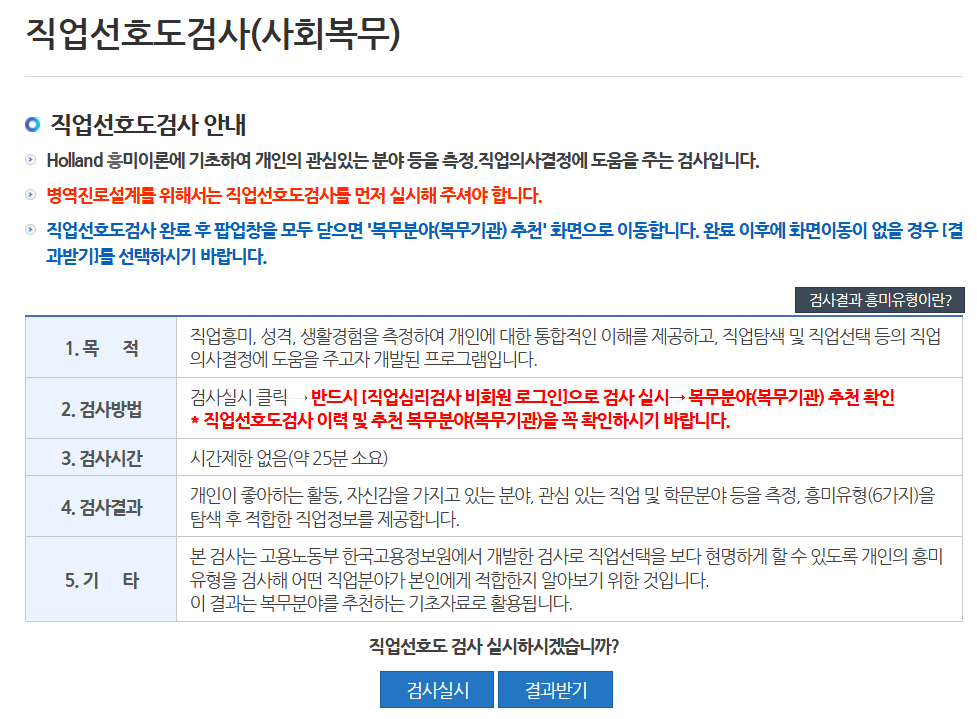 (경로) 병무청 누리집 검색창→ ‘직업선호도’ 조회→직업선호도(사회복무)→검사실시