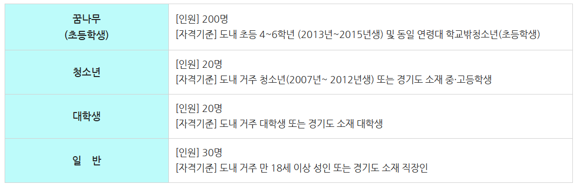 • 모집 대상: 경기도 내 거주자 또는 경기도 내 학교•직장 활동자