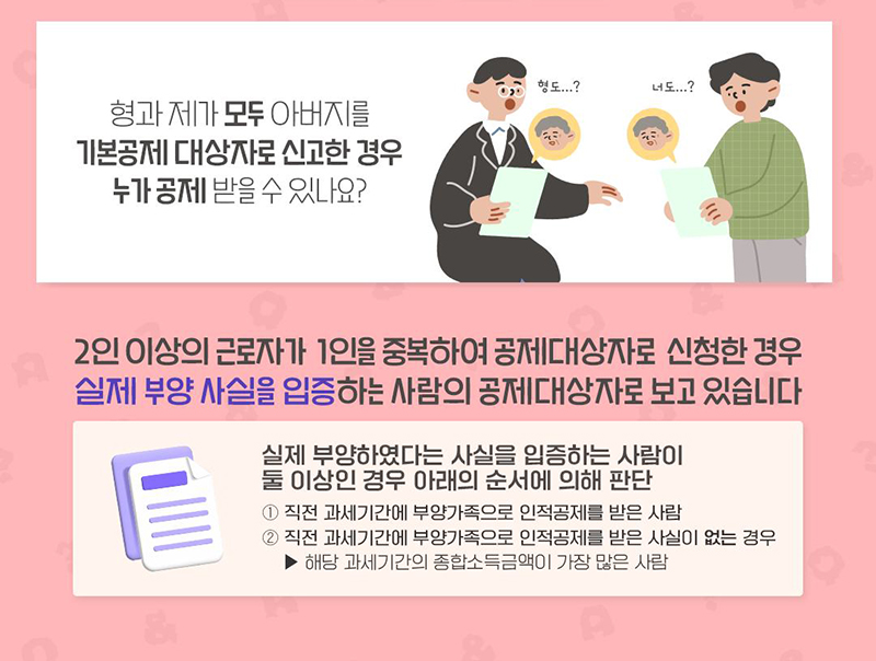 하지만, 형제자매와 중복 신청이 되는 경우 실제 부양 사실을 입증해야 하는데요, 판단 기준은 다음과 같습니다.